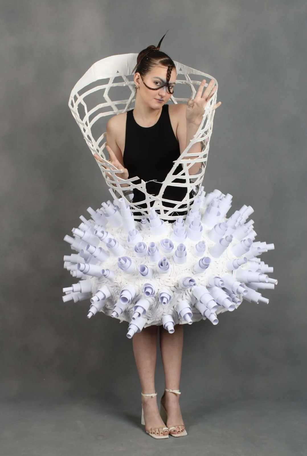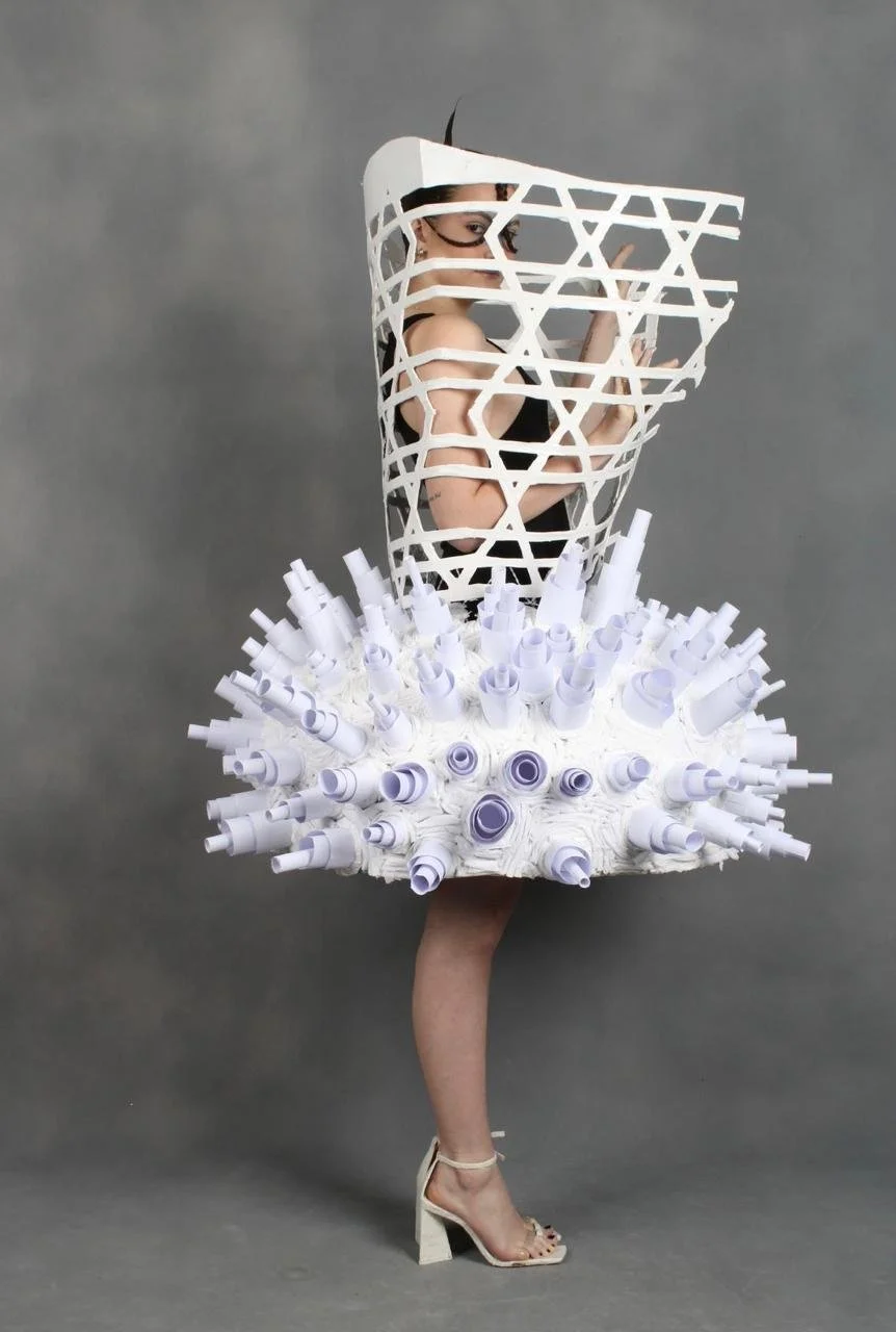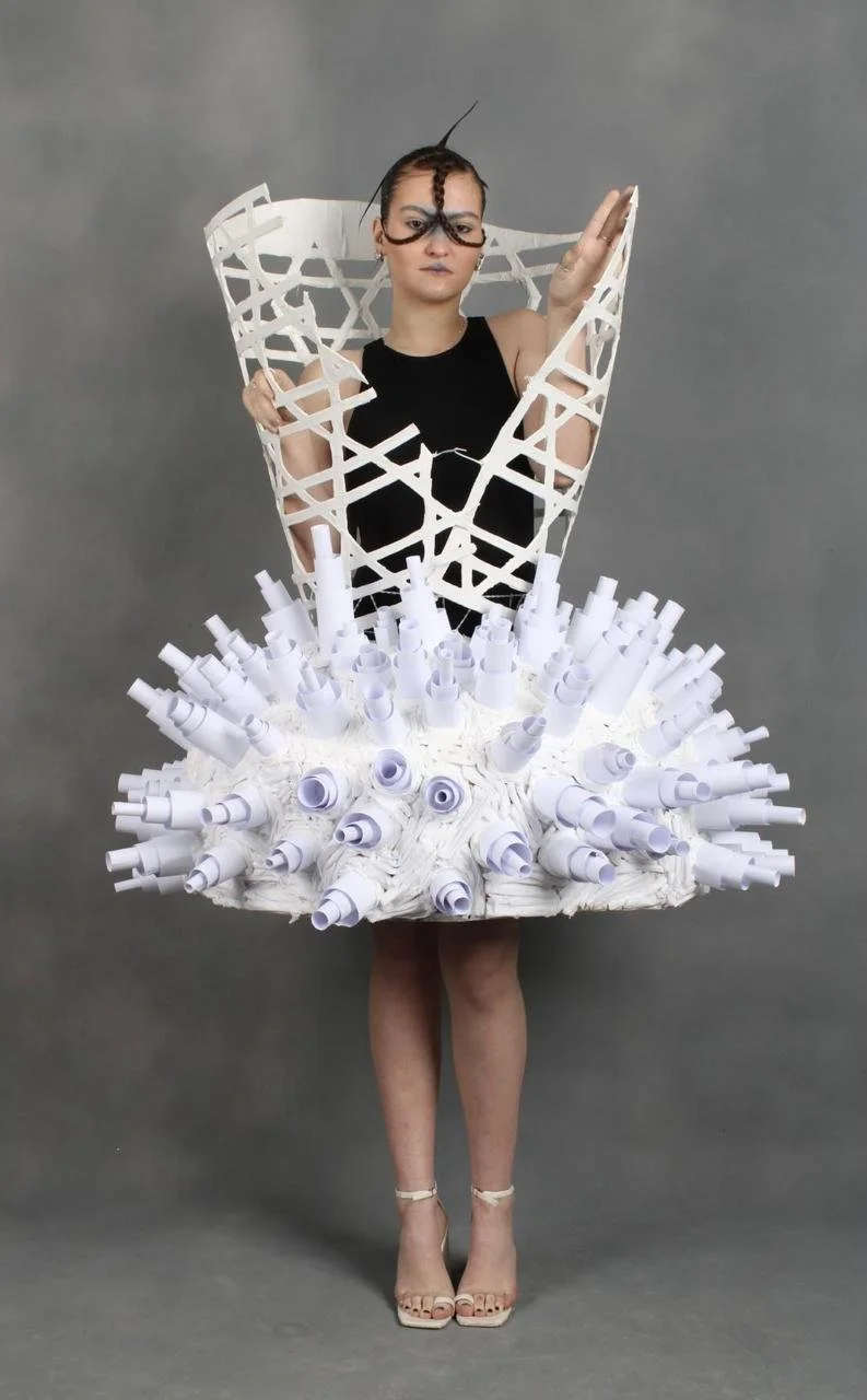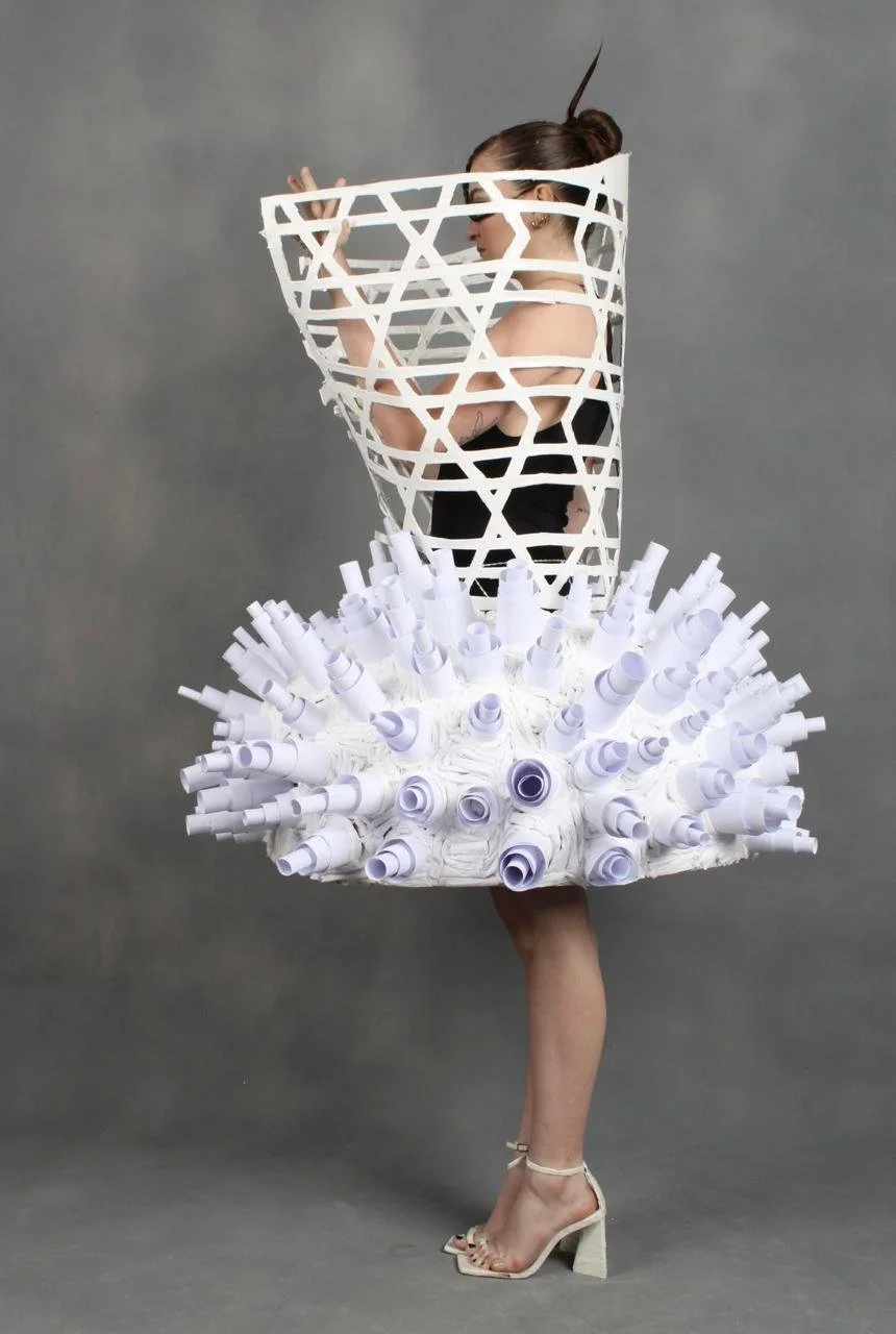 “Revelar SP” foi o projeto integrado do primeiro semestre do curso de bachalerado em Moda. Tínhamos como proposta fazer uma roupa inteiramente de papel inspirada em algum bairro da cidade de São Paulo. A roupa ao lado tinha como tema as janelas da Vila Madalena e Avenida Paulista. Ao longo do semestre, cada uma das integrantes do grupo desenvolveu uma serie de superfícies inspiradas nas vivências que tivemos nas visitas de campo destes bairros. A roupa é composta por duas estruturas, a de cima, que se enrola no corpo, presa por um arame, e a saia, com uma estrutura circular, tipo crinolina.